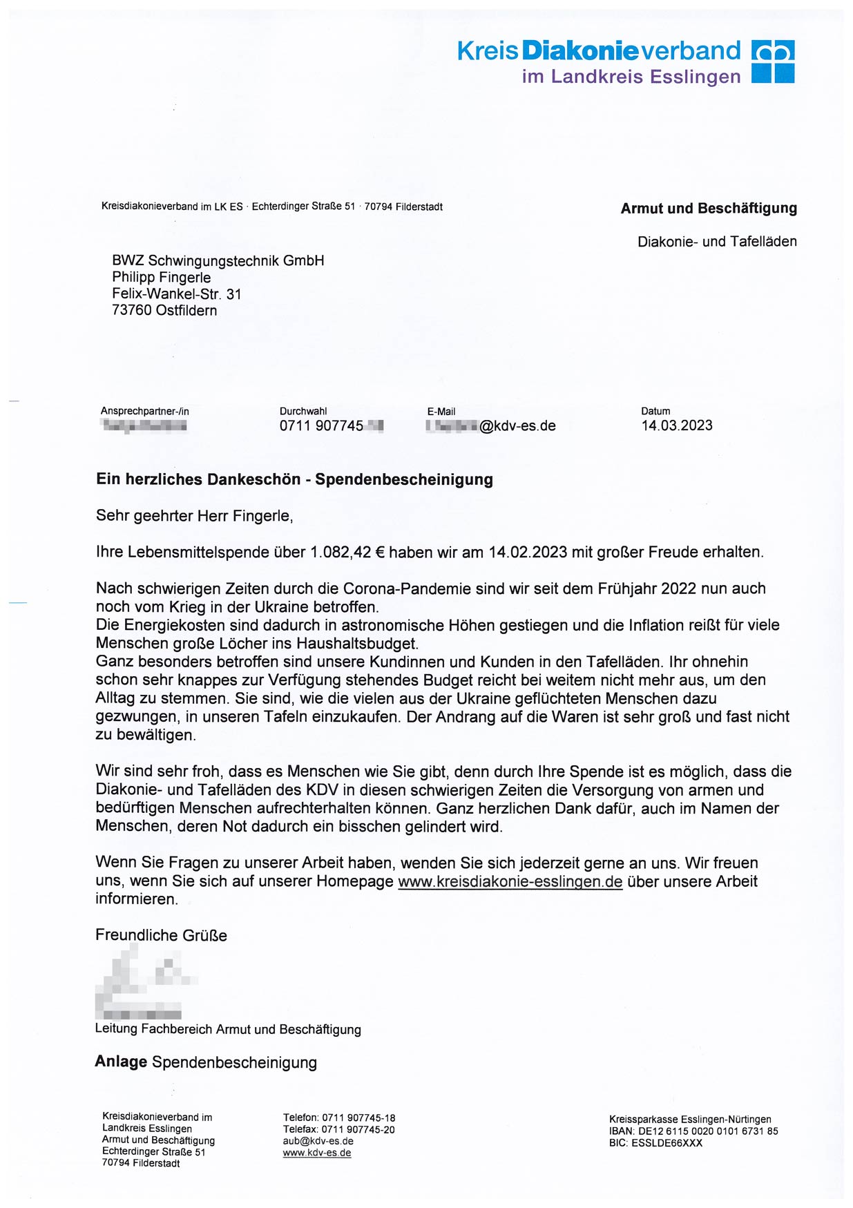Wie im Februar 2022, hat bwz® Schwingungstechnik auch heuer im Wintermonat Februar wieder eine Lebensmittelspende an die gemeinnützigen Tafelläden der Diakonie im Landkreis Esslingen gemacht.
